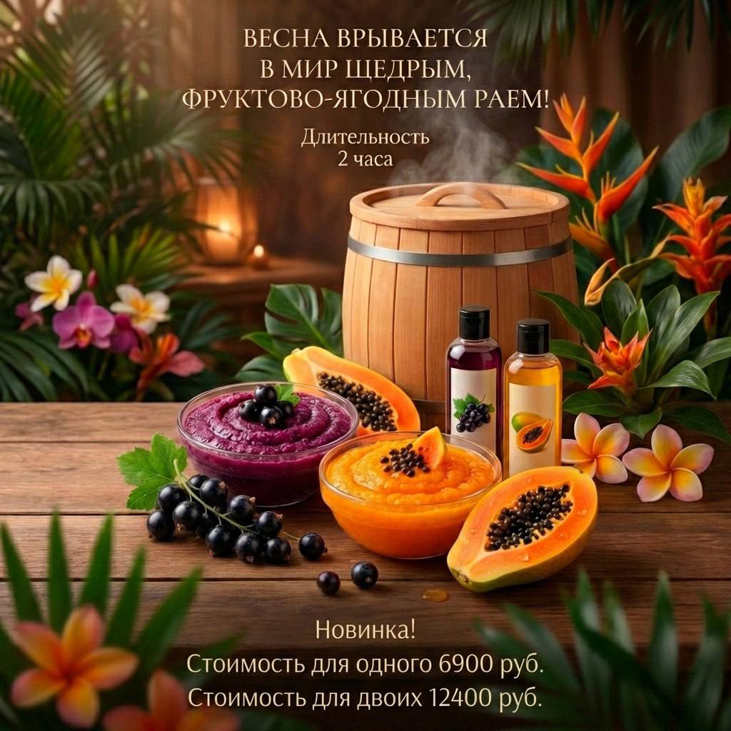 Эта уникальная Спа-программа перенесет в мир свежести и фруктовых ароматов. Подарит ощущение ценности совместного досуга с пользой для здоровья. Наши виртуозные мастера зарядят Вас жизнелюбием и позитивом, погрузив в оазис здоровья и расслабления с яркими фруктовыми процедурами от нежного скраба до питательных масок. Позвольте себе насладиться моментом и восстановить баланс тела и души.